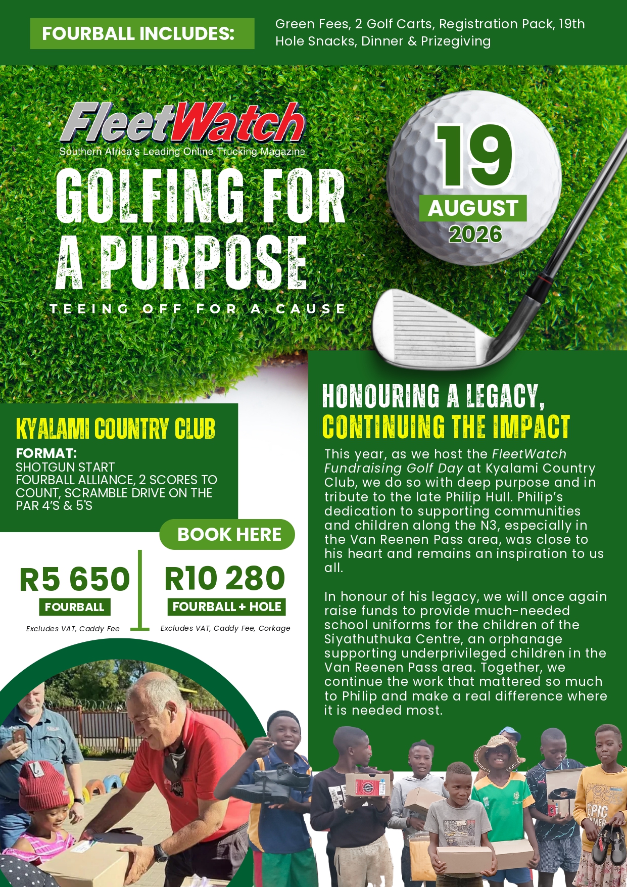 This year, as we host the FleetWatch Fundraising Golf Day at Kyalami Country Club, we do so with deep purpose and in tribute to the late Philip Hull. Philip’s dedication to supporting communities and children along the N3, especially in the Van Reenen Pass area, was close to his heart and remains an inspiration to us all.