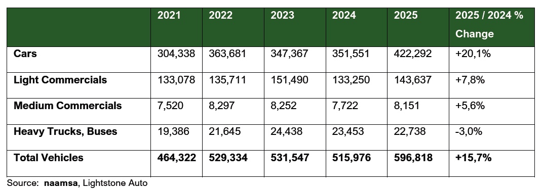 naamsa data confirms that aggregate industry sales grew by a robust 15,7% year-on-year to 596 818 units in 2025, reflecting renewed consumer confidence, improved credit conditions and the release of pent-up demand that had accumulated between 2021 and 2024.