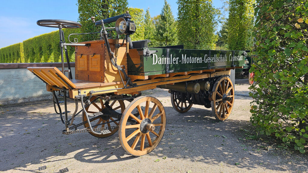 At the center of the historical section stood a reconstruction of the world’s first motorised truck, originally unveiled in 1896 by Gottlieb Daimler. Its two-cylinder “Phoenix” engine produced four horsepower from 1.06 litres. Drive was transmitted to the rear axle via belt and steering was chain operated.